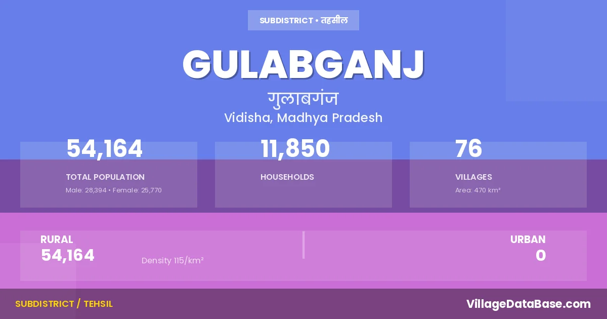 According to the 2011 census The total area of Gulabganj Tehsil is 470 km², with a population of 54164 people. The population density is 115 inhabitants per square kilometre, and there are approximately 11850 houses in the sub district.