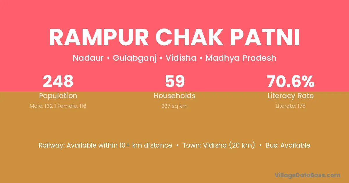 Vidisha (20 km) is the nearest town to Rampur Chak Patni village for major economic activities and is located approximately 20 km away.