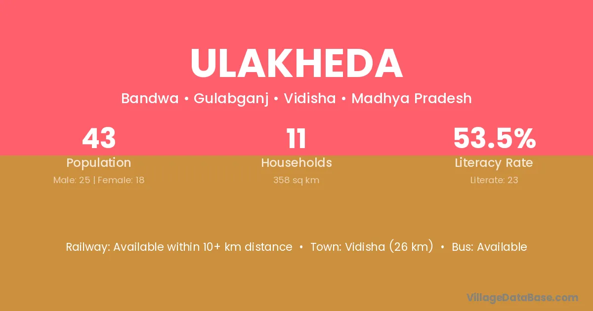 Vidisha (26 km) is the nearest town to Ulakheda village for major economic activities and is located approximately 26 km away.