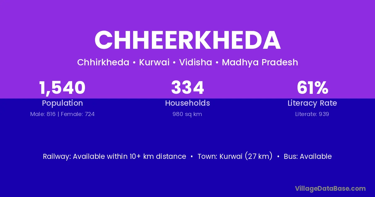 Kurwai (27 km) is the nearest town to Chheerkheda village for major economic activities and is located approximately 27 km away.