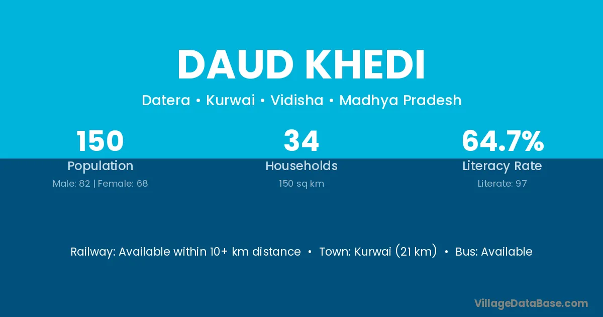 Kurwai (21 km) is the nearest town to Daud Khedi village for major economic activities and is located approximately 21 km away.