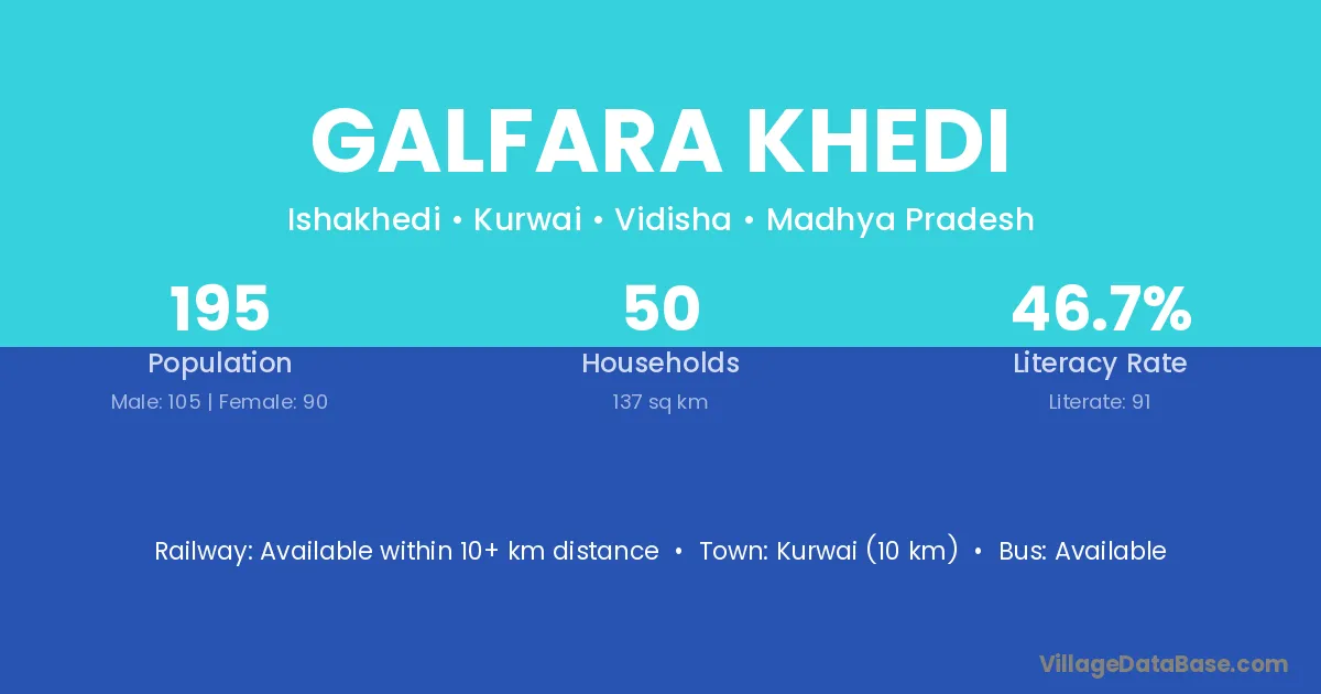 Kurwai (10 km) is the nearest town to Galfara Khedi village for major economic activities and is located approximately 10 km away.