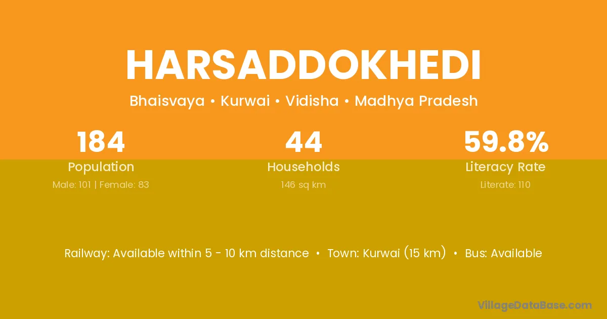 Harsaddokhedi village has a total population of 184 people, of which 101 are males and 83 are females.