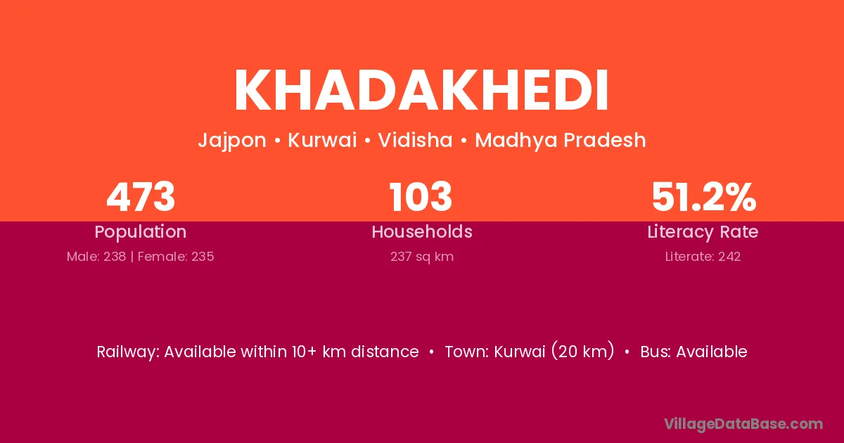 Khadakhedi village has a total population of 473 people, of which 238 are males and 235 are females.
