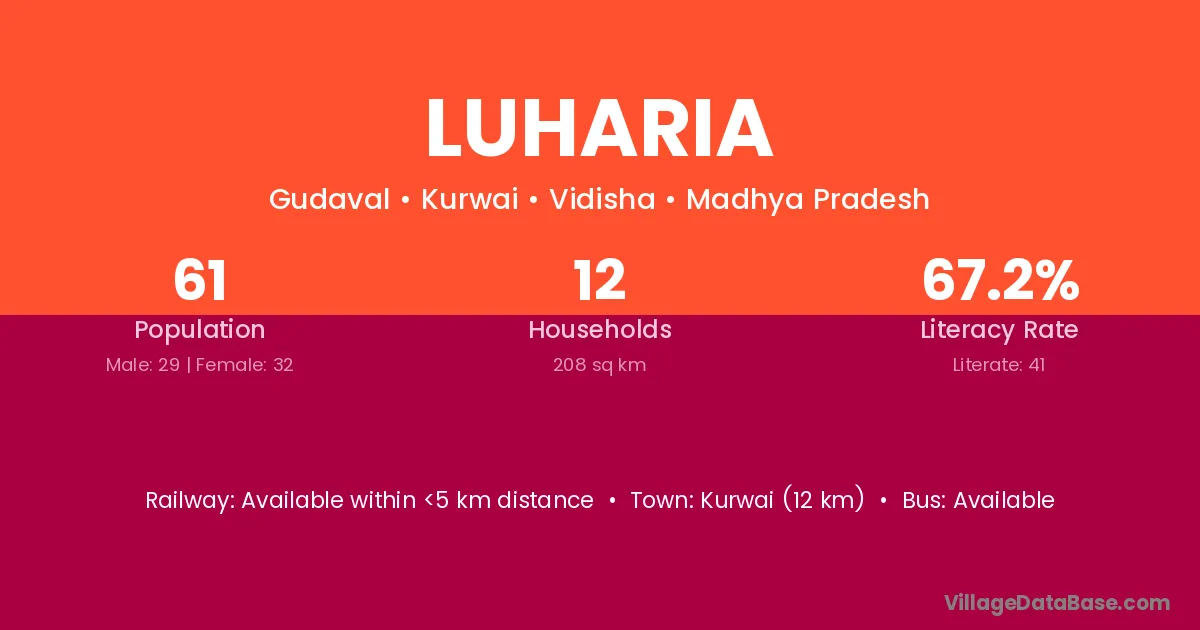 Kurwai (12 km) is the nearest town to Luharia village for major economic activities and is located approximately 12 km away.