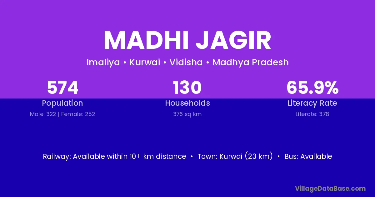 Kurwai (23 km) is the nearest town to Madhi Jagir village for major economic activities and is located approximately 23 km away.