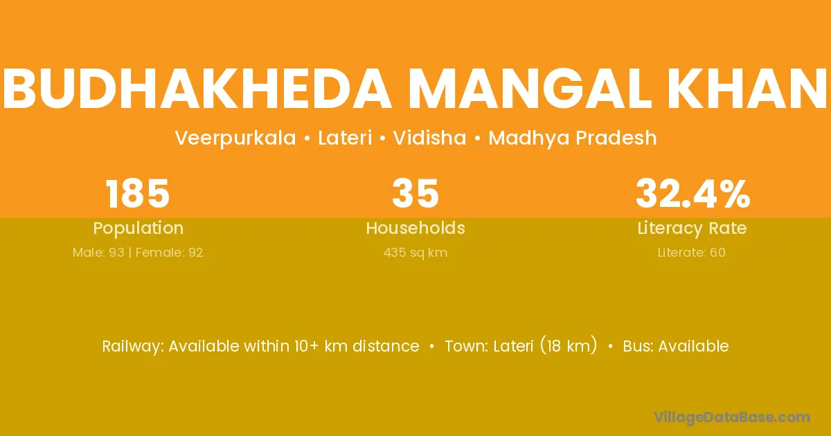 Lateri (18 km) is the nearest town to Budhakheda Mangal Khan village for major economic activities and is located approximately 18 km away.