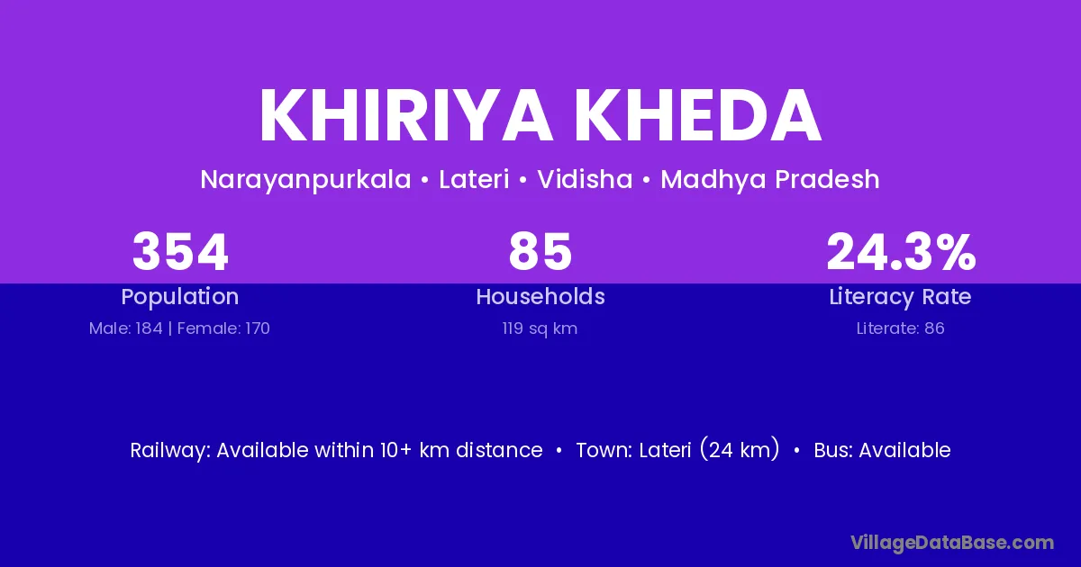 Lateri (24 km) is the nearest town to Khiriya Kheda village for major economic activities and is located approximately 24 km away.