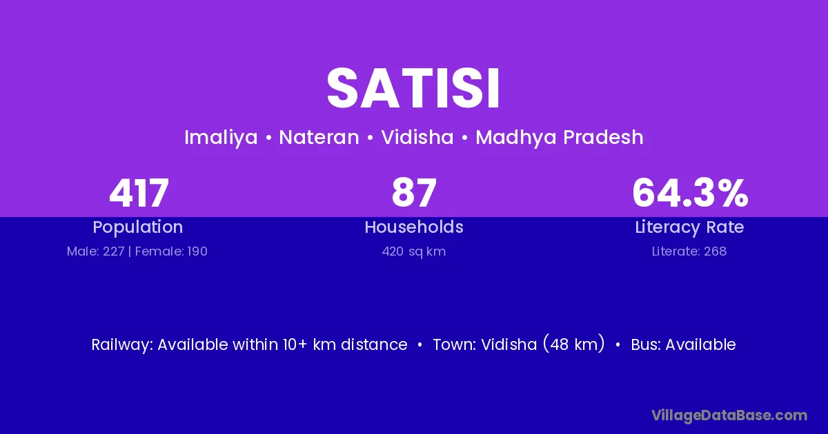 Vidisha (48 km) is the nearest town to Satisi village for major economic activities and is located approximately 48 km away.