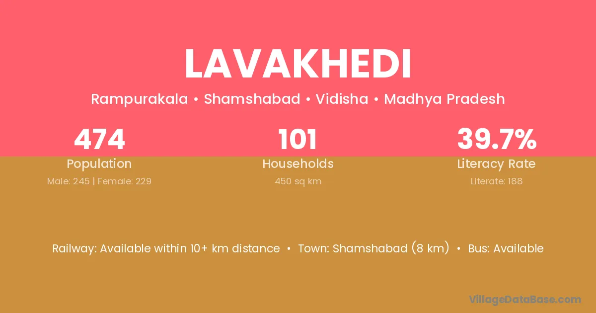 Lavakhedi village has a total population of 474 people, of which 245 are males and 229 are females.