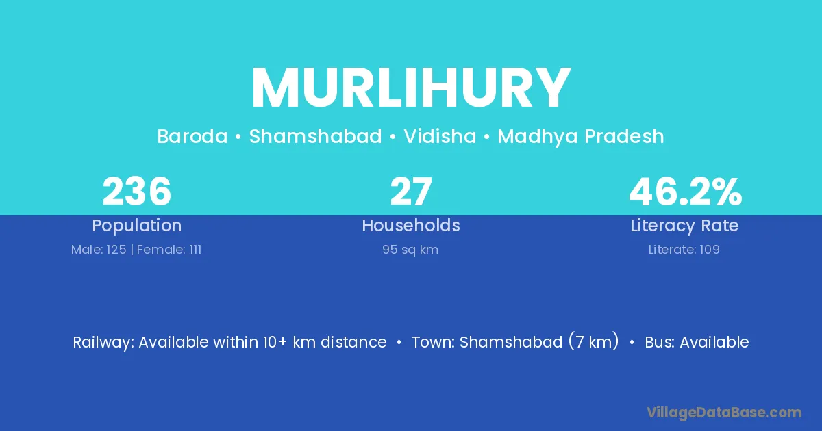 Shamshabad (7 km) is the nearest town to Murlihury village for major economic activities and is located approximately 7 km away.