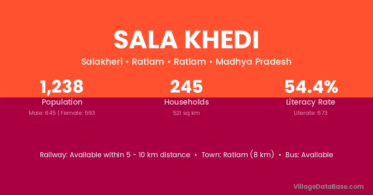Sala Khedi village has a total population of 1,002 people, of which 502 are males and 500 are females.