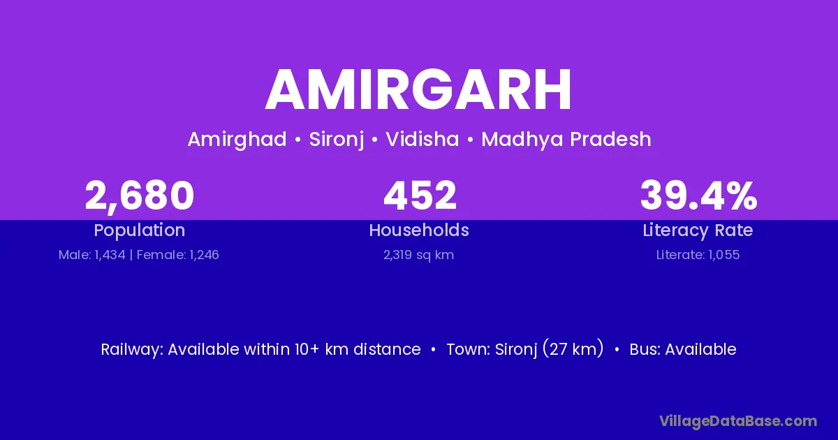 Sironj (27 km) is the nearest town to Amirgarh village for major economic activities and is located approximately 27 km away.