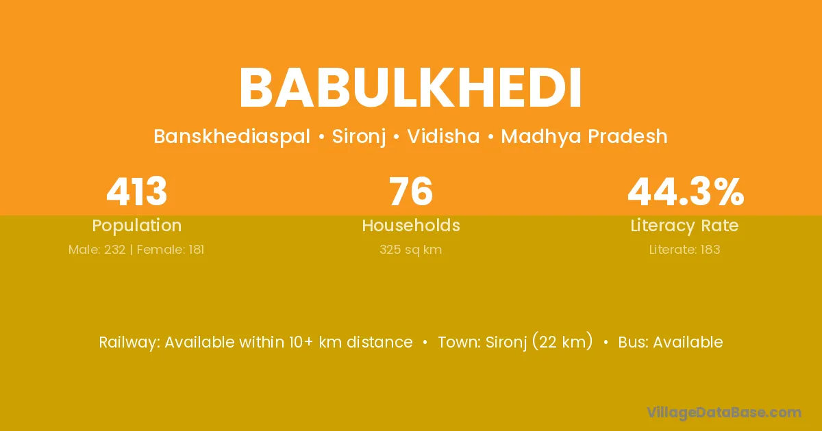 Babulkhedi village has a total population of 413 people, of which 232 are males and 181 are females.