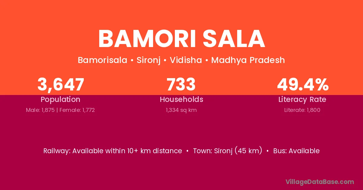 Sironj (45 km) is the nearest town to Bamori Sala village for major economic activities and is located approximately 45 km away.