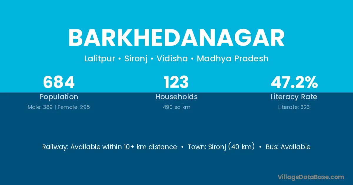 Barkhedanagar village has a total population of 684 people, of which 389 are males and 295 are females.
