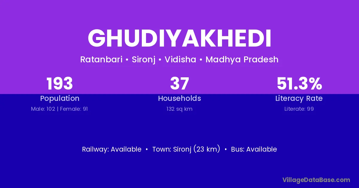 Sironj (23 km) is the nearest town to Ghudiyakhedi village for major economic activities and is located approximately 23 km away.