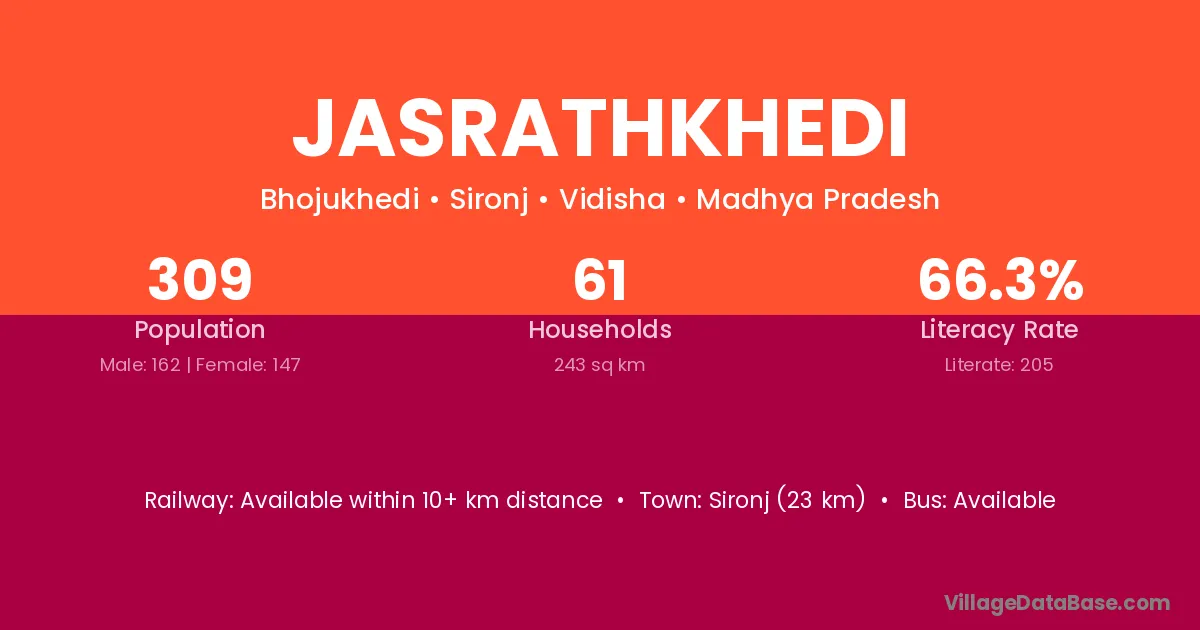 Sironj (23 km) is the nearest town to Jasrathkhedi village for major economic activities and is located approximately 23 km away.