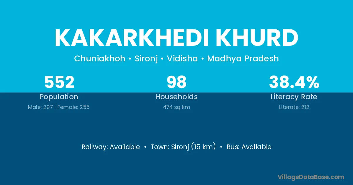 Sironj (15 km) is the nearest town to Kakarkhedi Khurd village for major economic activities and is located approximately 15 km away.