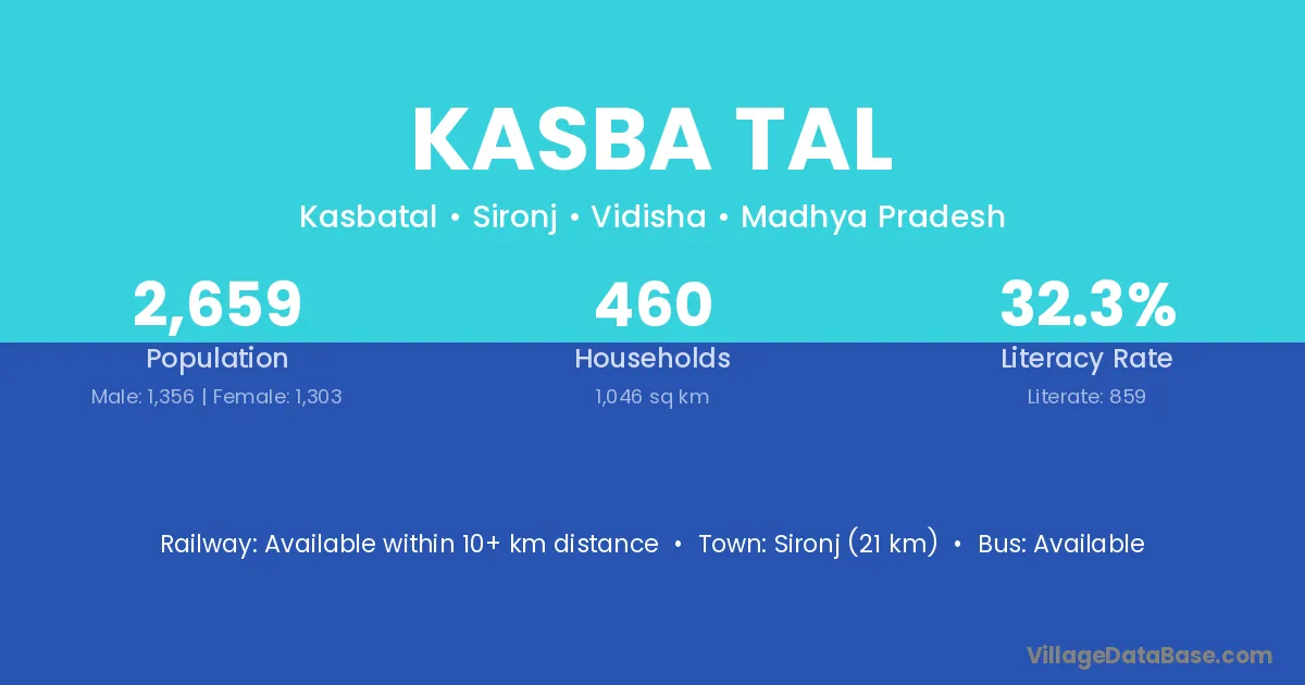 Sironj (21 km) is the nearest town to Kasba Tal village for major economic activities and is located approximately 21 km away.