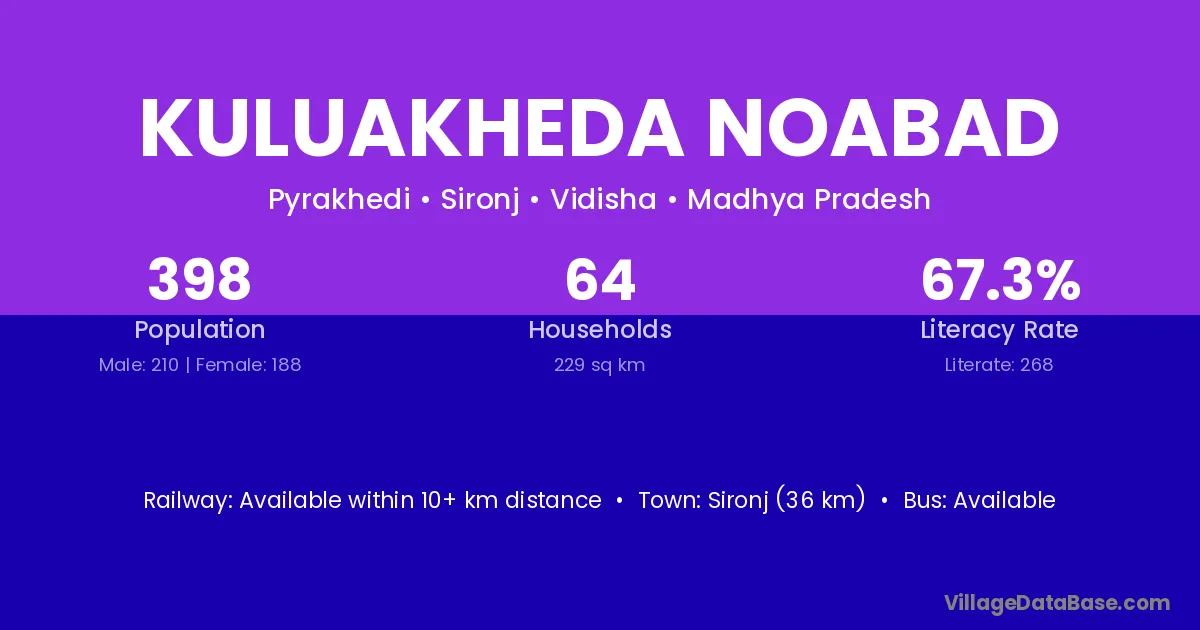 Sironj (36 km) is the nearest town to Kuluakheda Noabad village for major economic activities and is located approximately 36 km away.