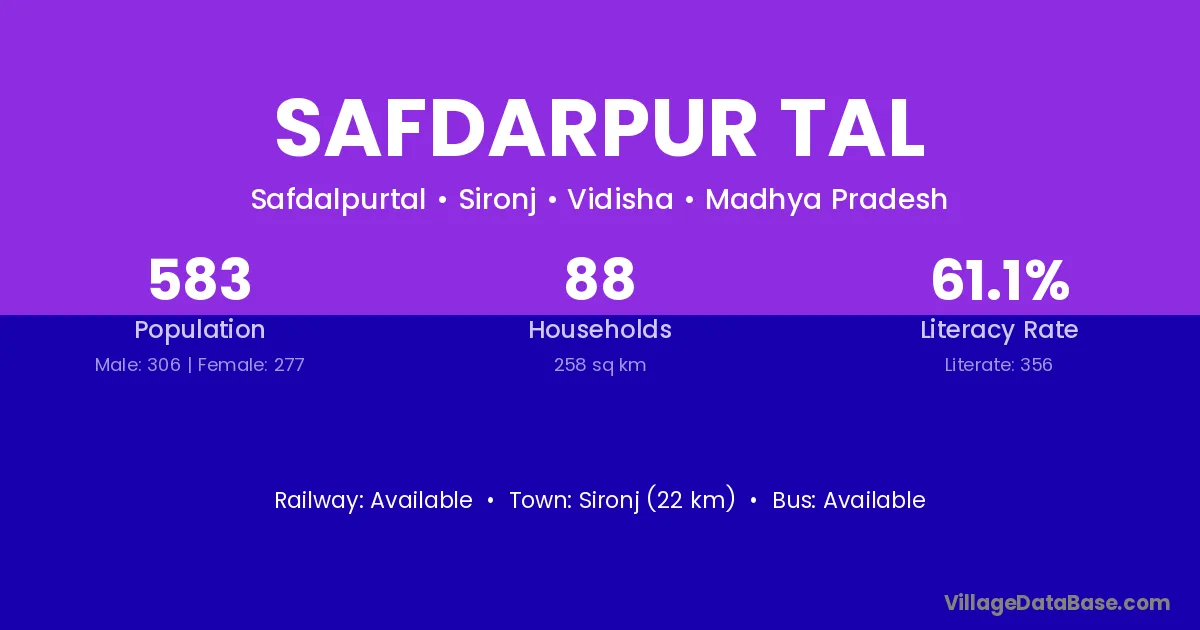 Sironj (22 km) is the nearest town to Safdarpur Tal village for major economic activities and is located approximately 22 km away.