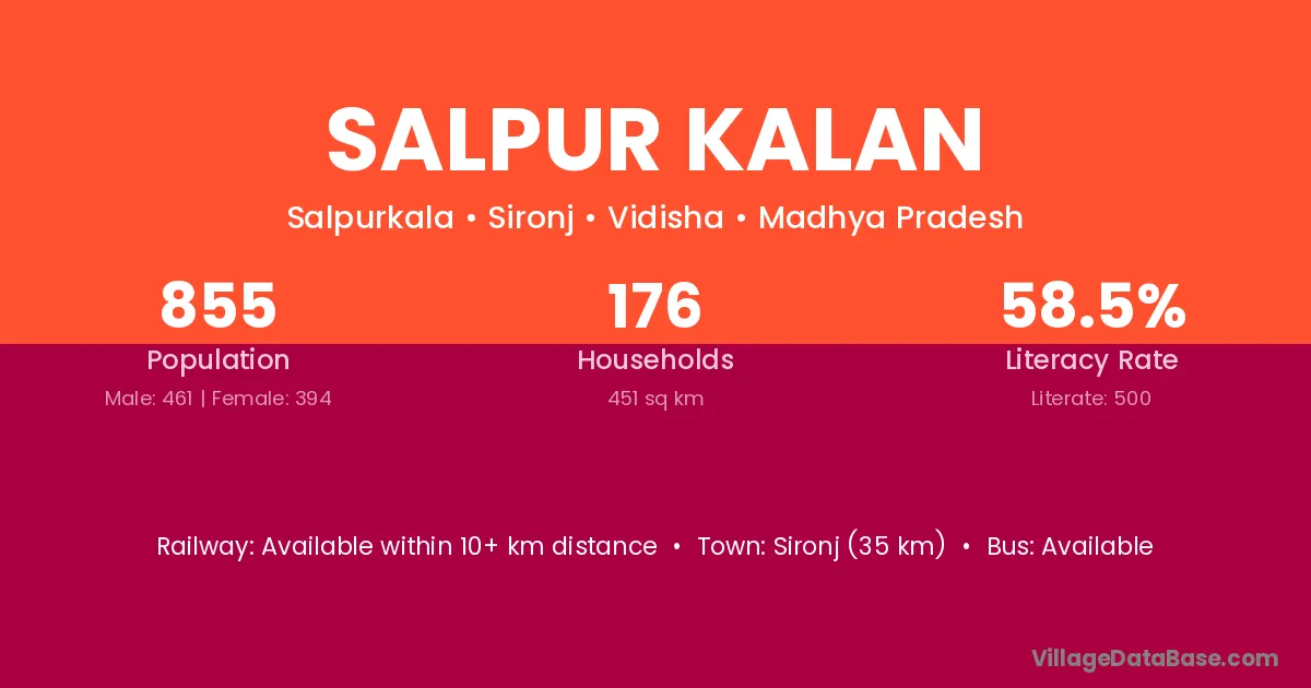 Sironj (35 km) is the nearest town to Salpur Kalan village for major economic activities and is located approximately 35 km away.