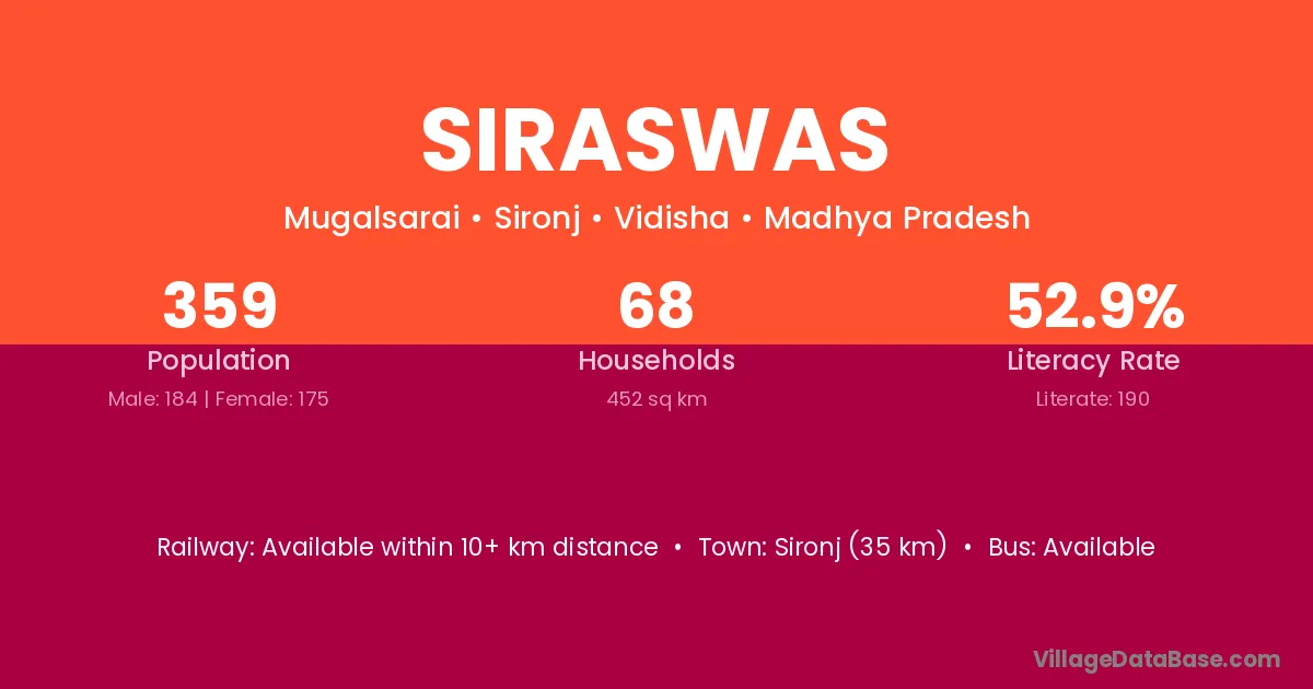 Sironj (35 km) is the nearest town to Siraswas village for major economic activities and is located approximately 35 km away.