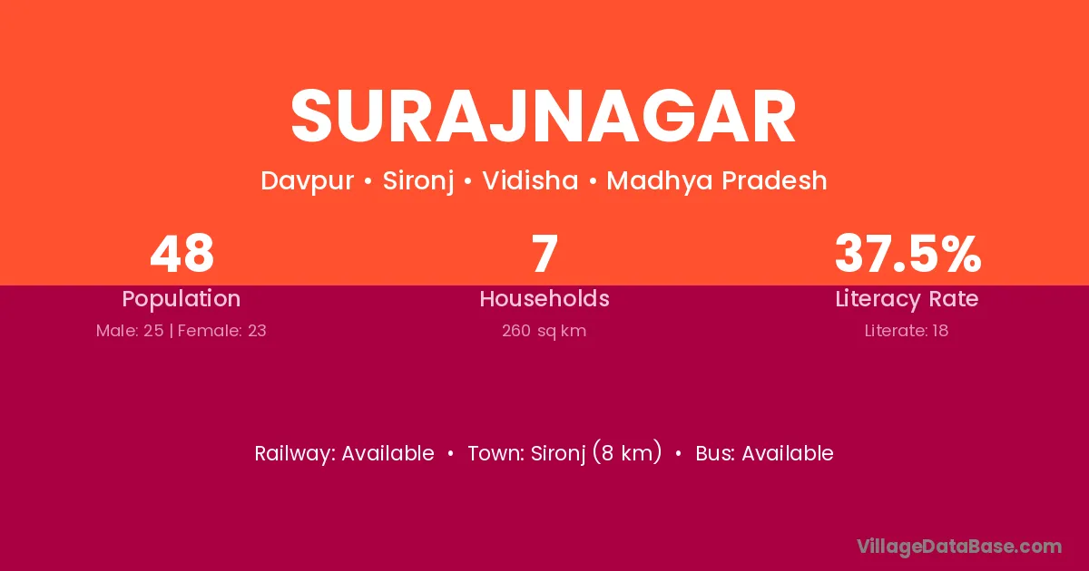 Sironj (8 km) is the nearest town to Surajnagar village for major economic activities and is located approximately 8 km away.
