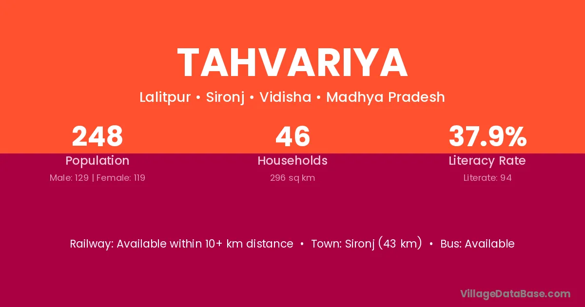 Sironj (43 km) is the nearest town to Tahvariya village for major economic activities and is located approximately 43 km away.