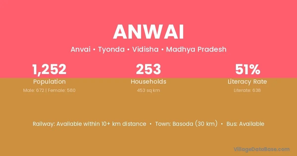 Basoda (30 km) is the nearest town to Anwai village for major economic activities and is located approximately 30 km away.