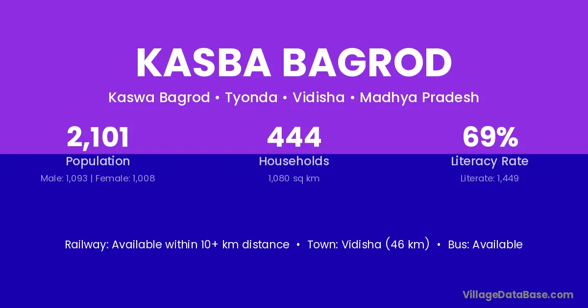 Vidisha (46 km) is the nearest town to Kasba Bagrod village for major economic activities and is located approximately 46 km away.