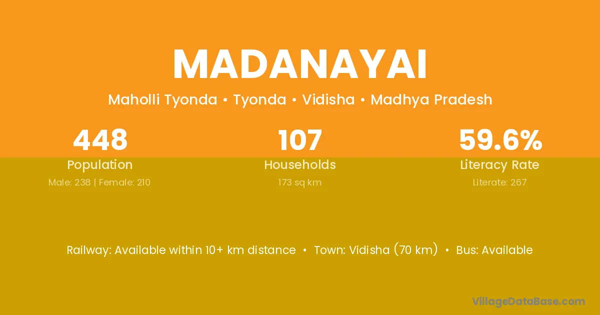 Vidisha (70 km) is the nearest town to Madanayai village for major economic activities and is located approximately 70 km away.