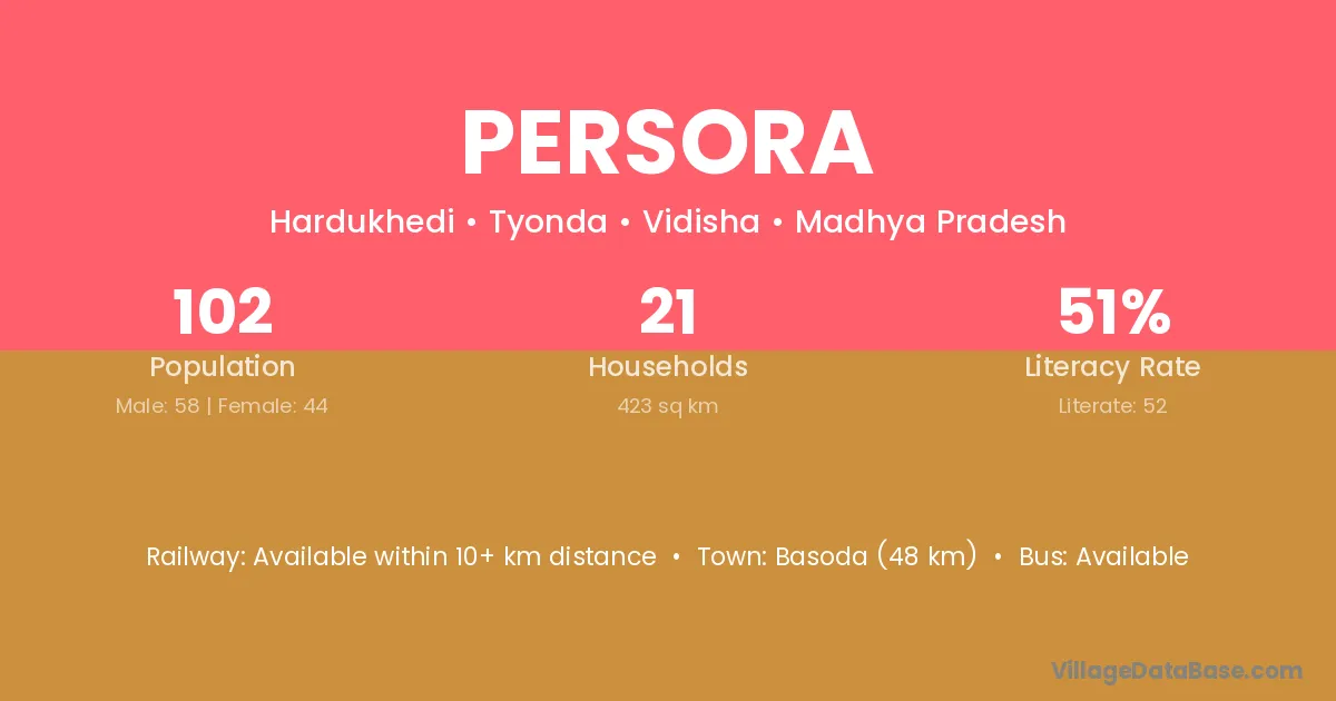 Basoda (48 km) is the nearest town to Persora village for major economic activities and is located approximately 48 km away.