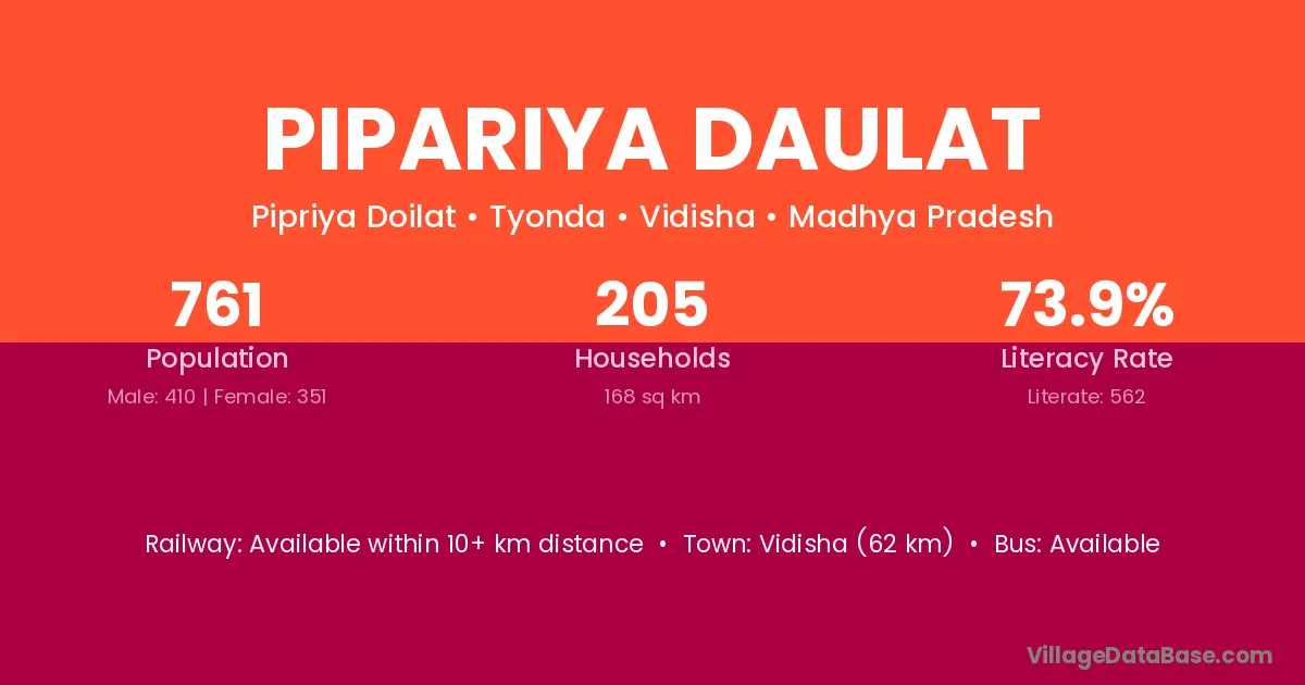 Vidisha (62 km) is the nearest town to Pipariya Daulat village for major economic activities and is located approximately 62 km away.