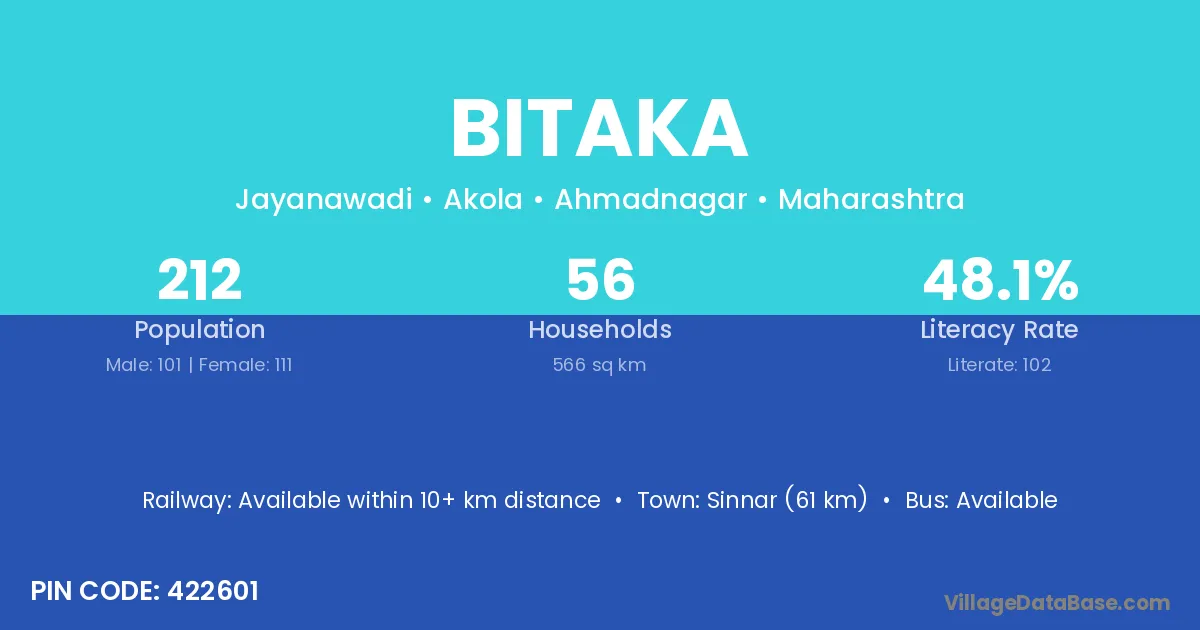 Sinnar (61 km) is the nearest town to Bitaka village for major economic activities and is located approximately 61 km away.
