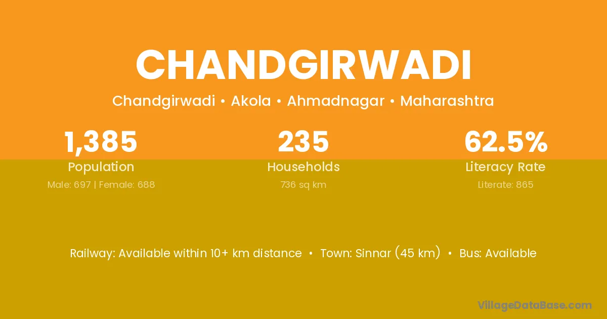 Sinnar (45 km) is the nearest town to Chandgirwadi village for major economic activities and is located approximately 45 km away.