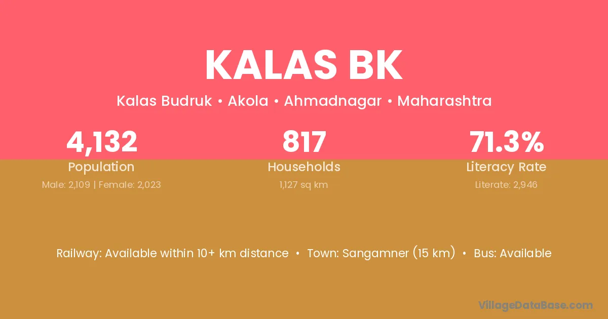 Sangamner (15 km) is the nearest town to Kalas Bk village for major economic activities and is located approximately 15 km away.