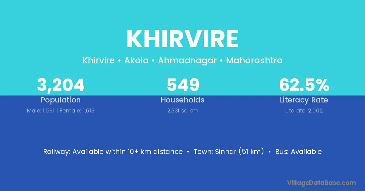 Sinnar (51 km) is the nearest town to Khirvire village for major economic activities and is located approximately 51 km away.