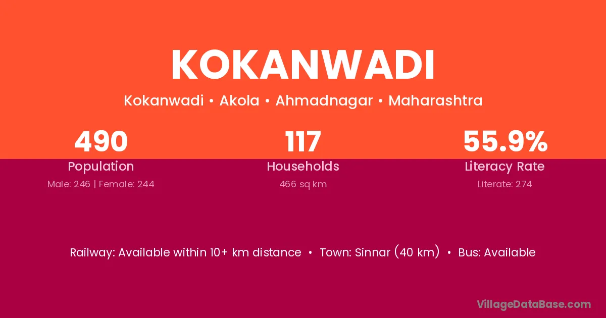 Kokanwadi village has a total population of 490 people, of which 246 are males and 244 are females.