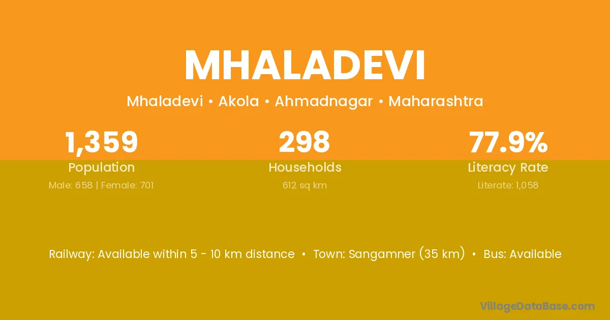 Mhaladevi village has a total population of 1,359 people, of which 658 are males and 701 are females.