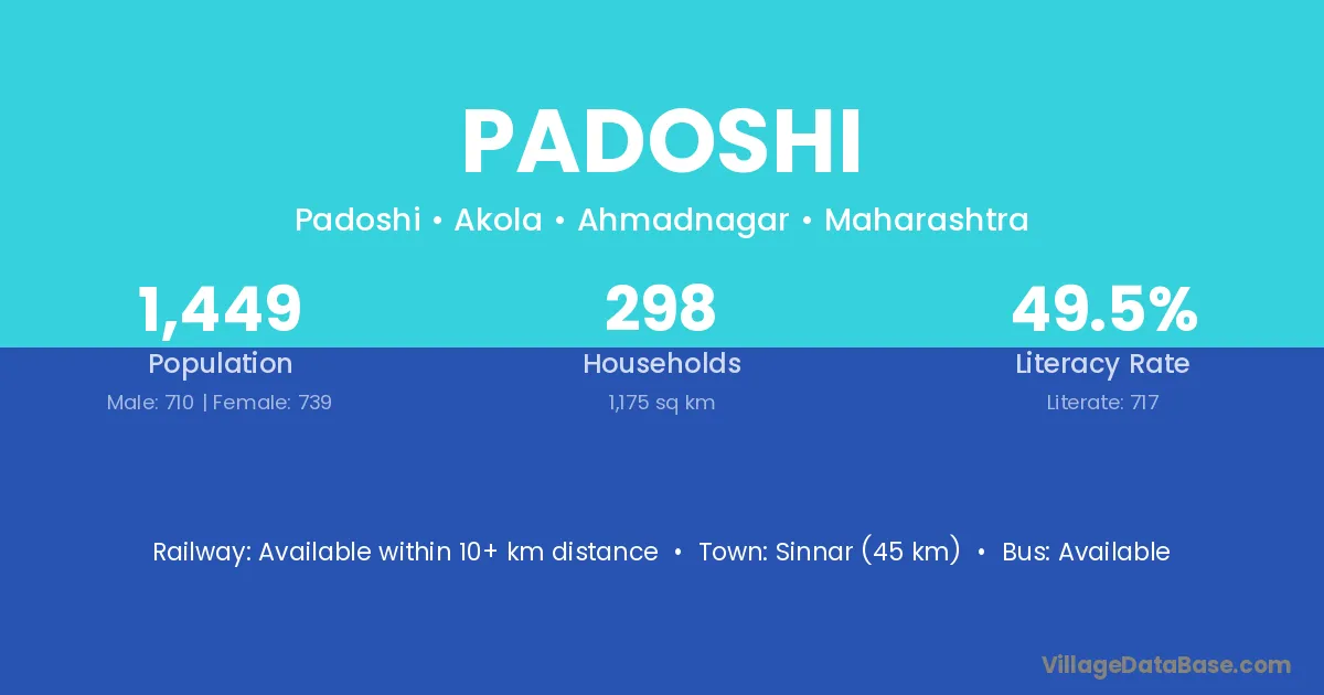 Sinnar (45 km) is the nearest town to Padoshi village for major economic activities and is located approximately 45 km away.