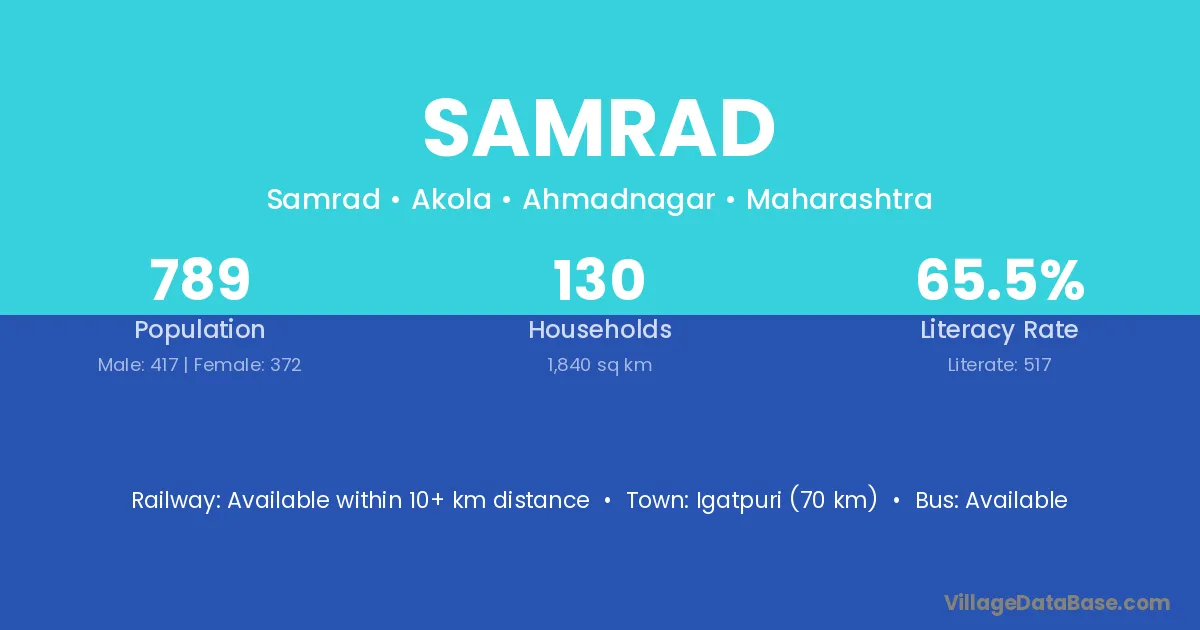 Igatpuri (70 km) is the nearest town to Samrad village for major economic activities and is located approximately 70 km away.