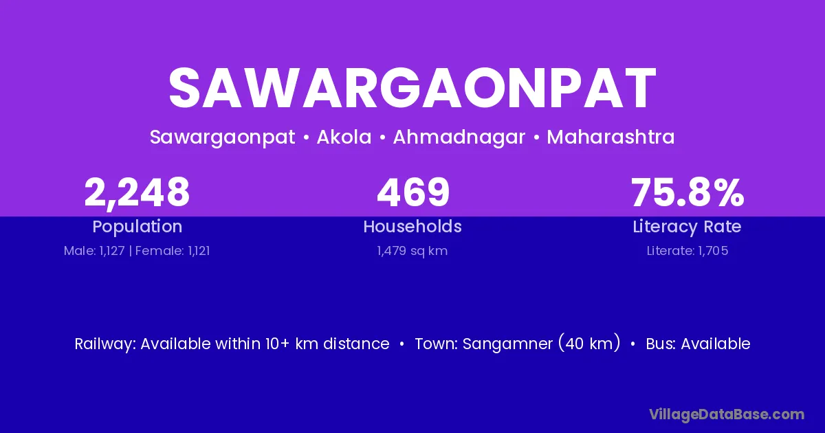 Sangamner (40 km) is the nearest town to Sawargaonpat village for major economic activities and is located approximately 40 km away.