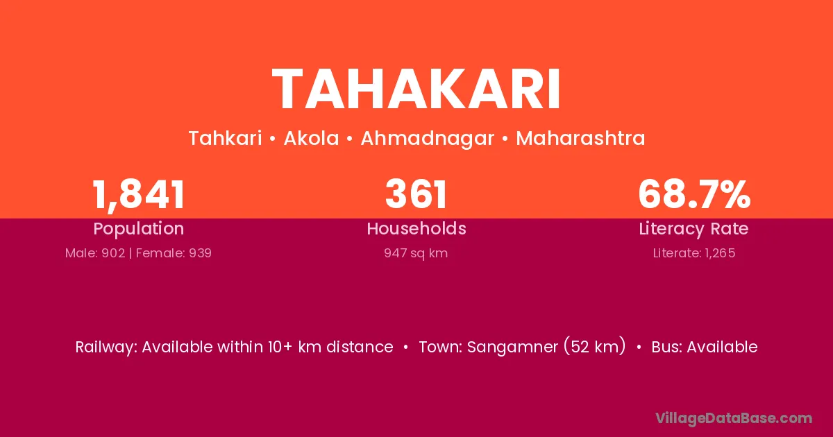 Sangamner (52 km) is the nearest town to Tahakari village for major economic activities and is located approximately 52 km away.