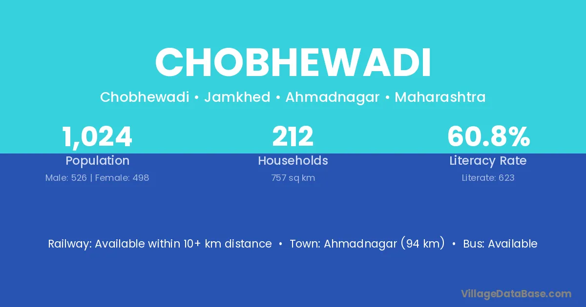 Ahmadnagar (94 km) is the nearest town to Chobhewadi village for major economic activities and is located approximately 94 km away.