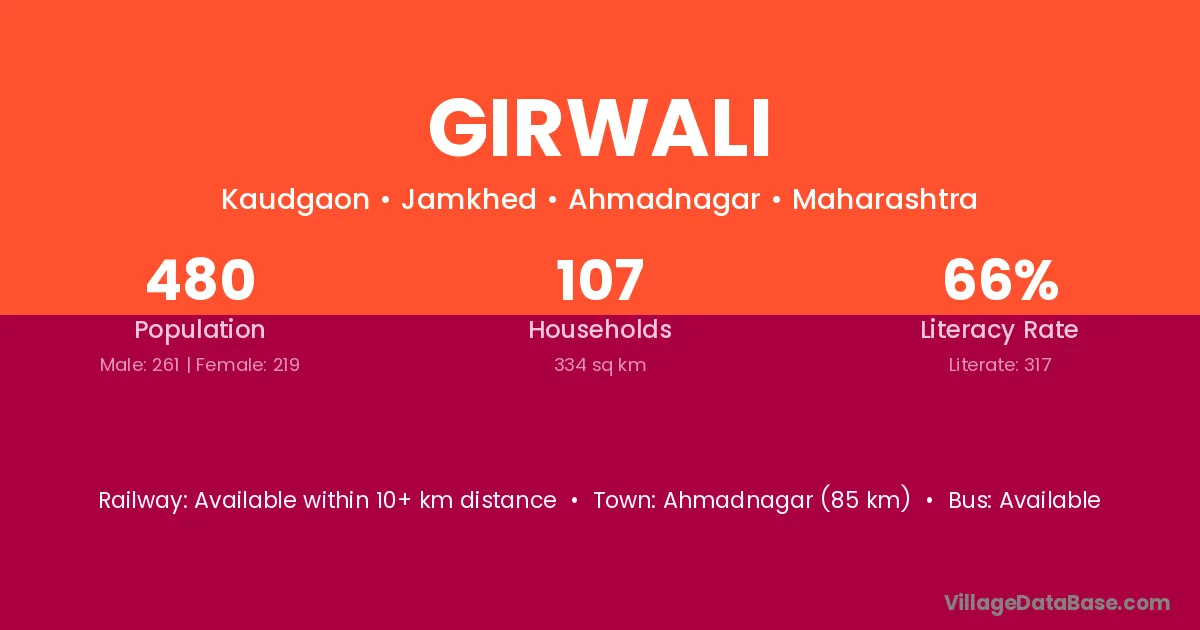 Ahmadnagar (85 km) is the nearest town to Girwali village for major economic activities and is located approximately 85 km away.