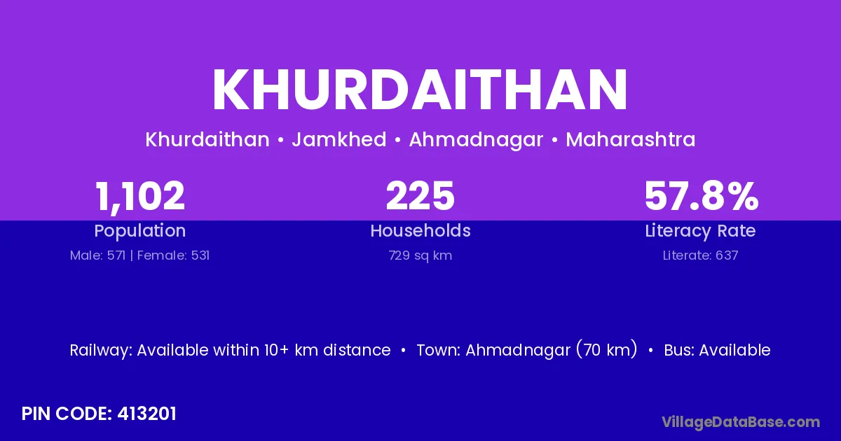 Ahmadnagar (70 km) is the nearest town to Khurdaithan village for major economic activities and is located approximately 70 km away.