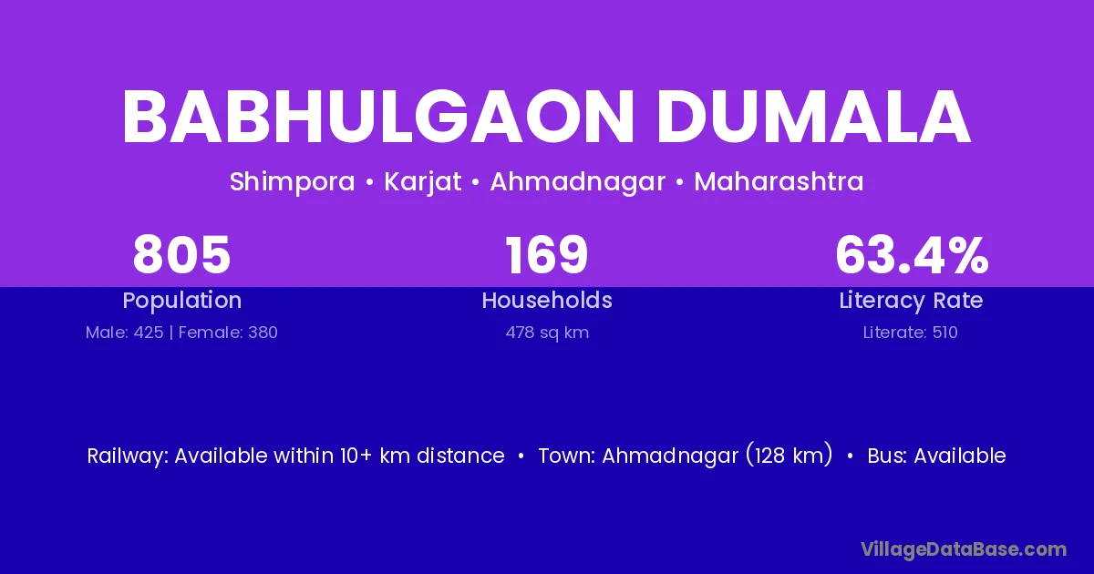 Ahmadnagar (128 km) is the nearest town to Babhulgaon Dumala village for major economic activities and is located approximately 128 km away.