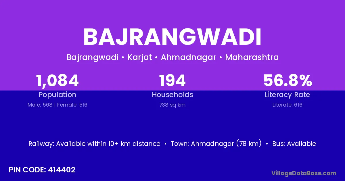 Ahmadnagar (78 km) is the nearest town to Bajrangwadi village for major economic activities and is located approximately 78 km away.